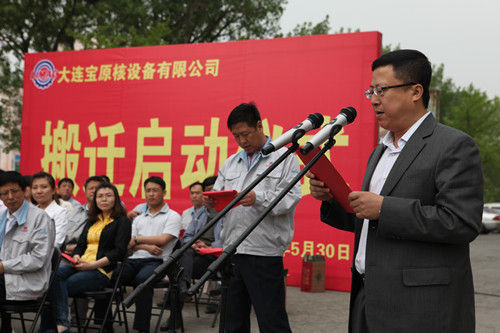 大連寶原總經理溫殿水發表講話,經過一年多來的廠房建設現已竣工,搬遷工作今天正式啟動,他表示,在全體員工的共同努力下,再創新的業績,為我國第三代核電技術設備的國產化,為地方經濟的發展做出應有貢獻。