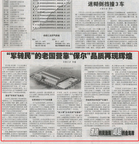 大連日報在2011年8月16日A4版中,以“‘軍轉民’的老國營靠‘保爾’品質再現輝煌”為標題對大連寶原核設備有限公司進行了報道。原文轉載如下: