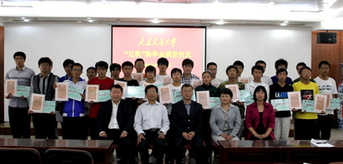 “遼機助學金”頒發儀式伊始,首先播放了集團公司“鳳凰涅槃,光明更生”的企業宣傳片,集團副總裁杜堅毅先生宣讀了第二屆“遼機助學金”25名獲得者名單。集團董事長吳巖、副總裁杜堅毅、董事會秘書馬桂環與校方領導一同為受資助的大一新生頒發助學金。吳巖董事長和大連交通大學黨委副書記劉璽明別代表校企雙方發表了講話,對獲得資助同學表示祝賀,并期望獲獎同學努力學習,用自己的才智來回饋社會,為社會發展做出貢獻。