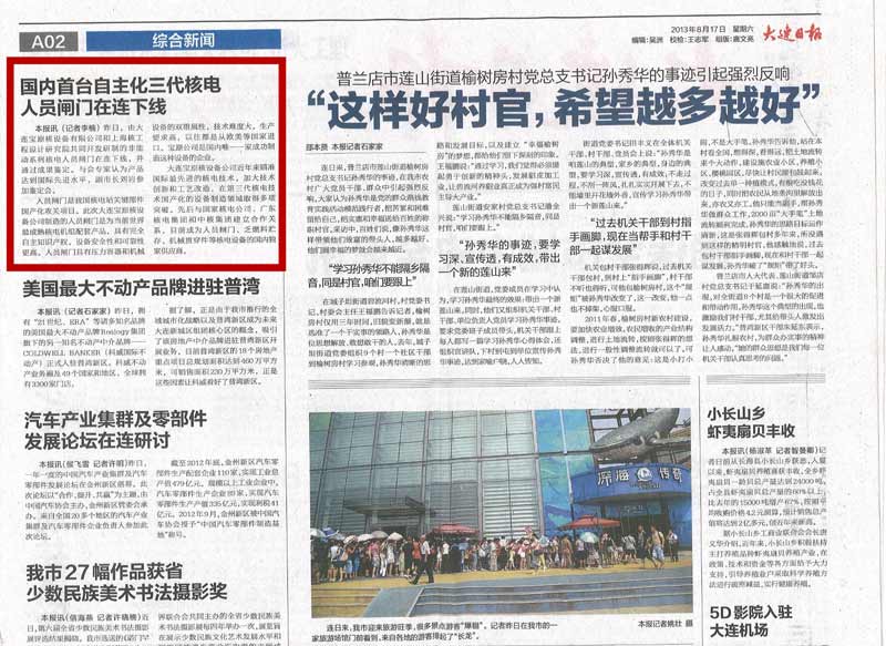 《大連日?qǐng)?bào)》在2013年8月17日 A02版,以“國(guó)內(nèi)首臺(tái)自主化三代核電人員閘門在連下線”為標(biāo)題對(duì)大連寶原核設(shè)備有限公司“自主化非能動(dòng)系列核電廠人員閘門樣機(jī)”成果鑒定會(huì)進(jìn)行了報(bào)道。原文轉(zhuǎn)載如下: