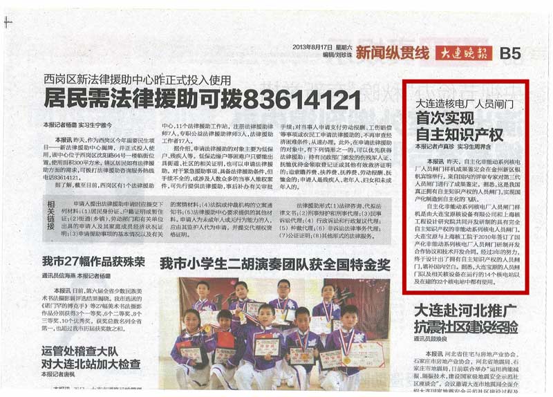 《大連晚報》在2013年8月17日 B5版,以“大連造核電廠人員閘門 首次實現(xiàn)自主知識產(chǎn)權(quán)”為標題對大連寶原核設(shè)備有限公司“自主化非能動系列核電廠人員閘門樣機”成果鑒定會進行了報道。原文轉(zhuǎn)載如下: