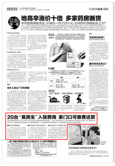 《半島晨報(bào)》在2015年6月16日A23版,以“20臺(tái)‘易民生’入駐西崗,家門口可繳費(fèi)還款”為標(biāo)題對(duì)大連迅通網(wǎng)絡(luò)技術(shù)有限公司“易民生”智能終端進(jìn)行了報(bào)道。原文轉(zhuǎn)載如下: